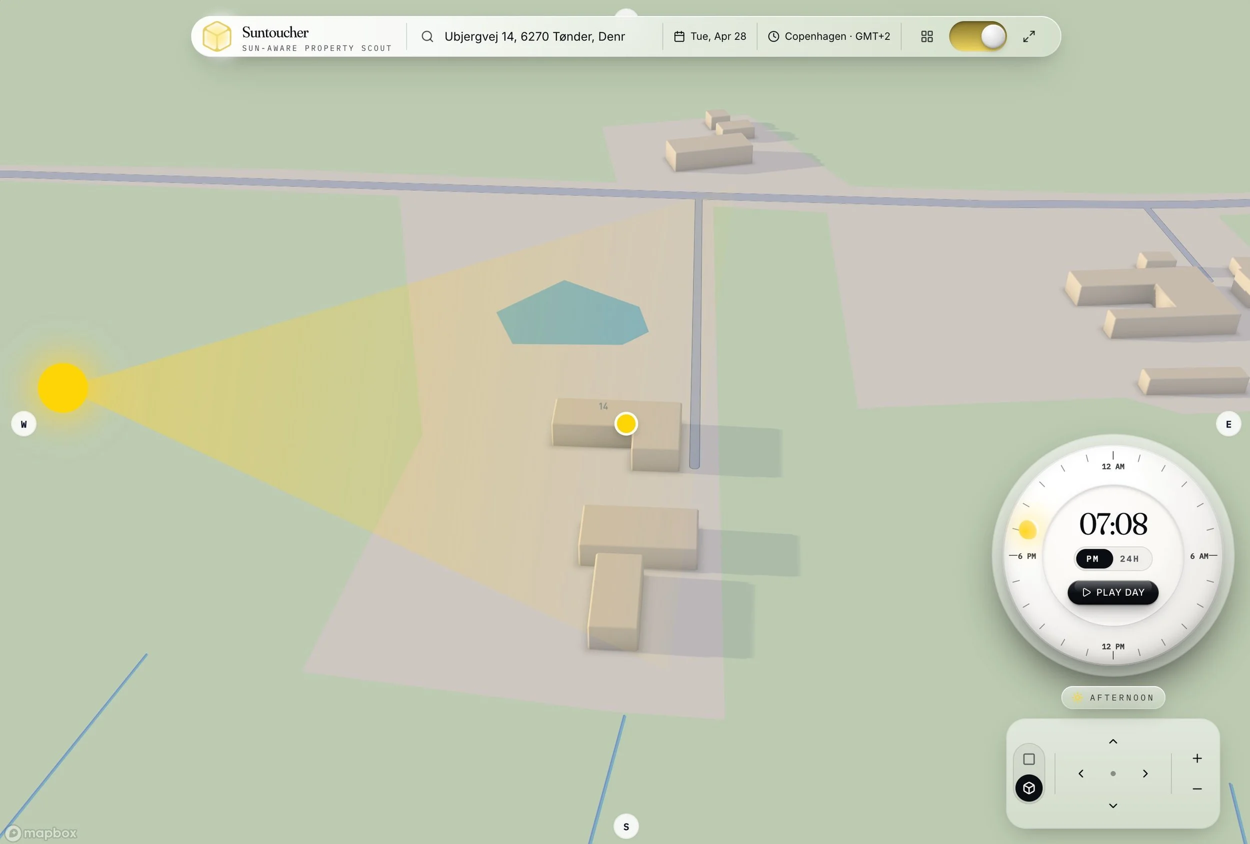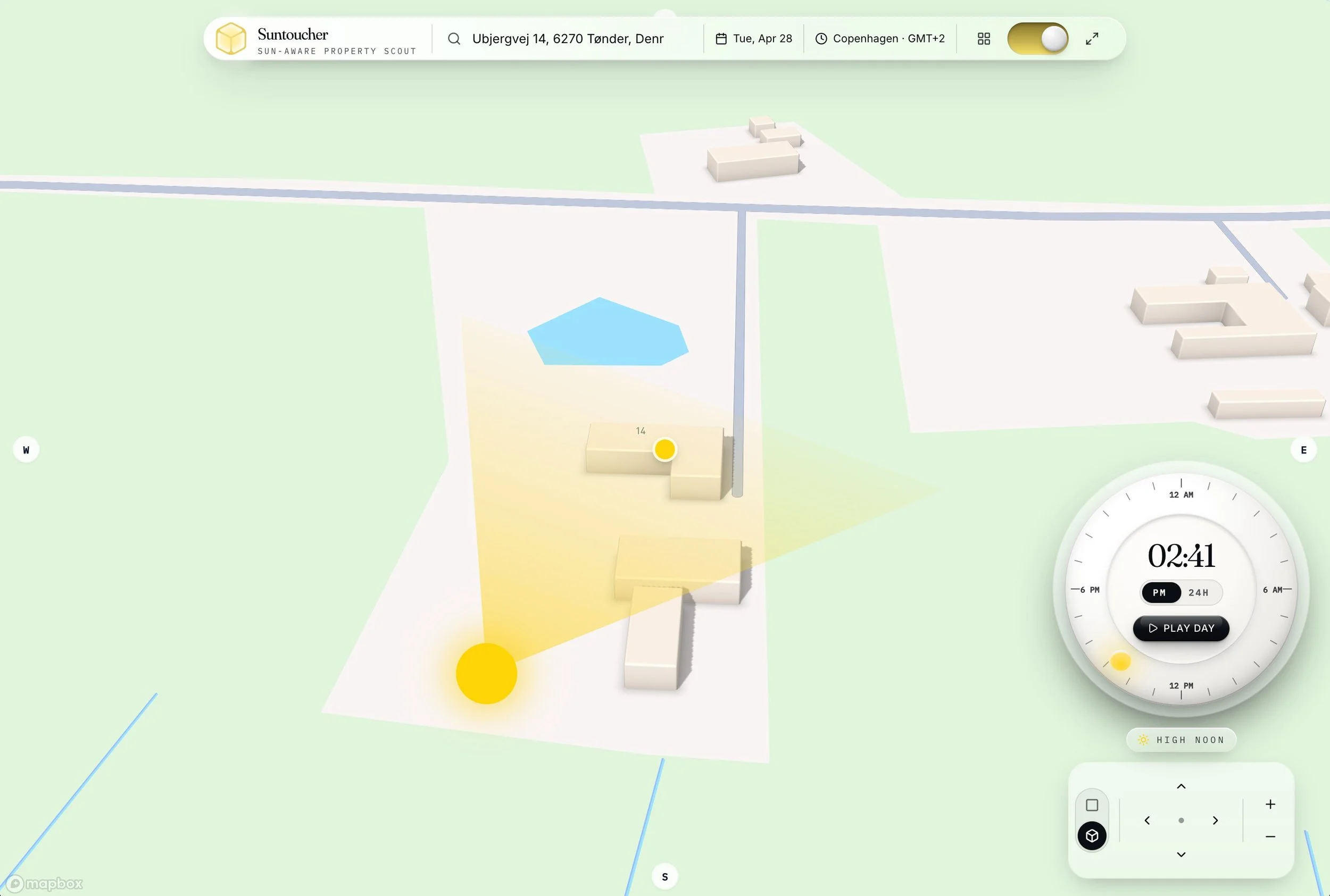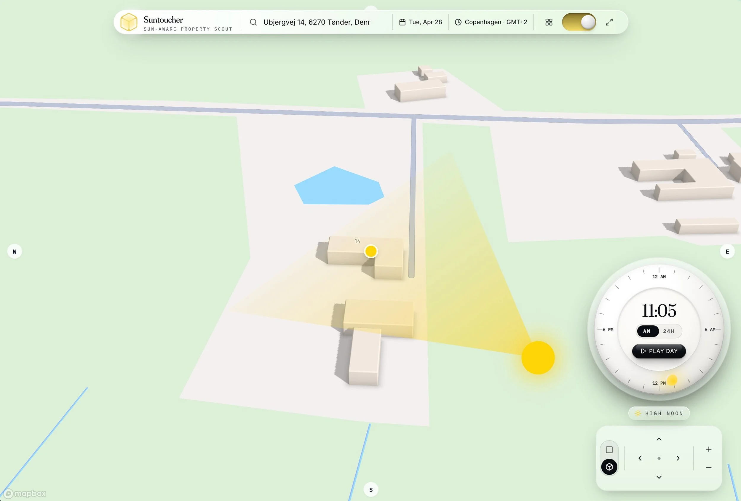 The 3D map view is where the tool earns its name. Buildings, terrain, and surrounding context are rendered as three-dimensional geometry, so the light cone doesn't just show where the sun is in the sky — it shows where the sun actually reaches the ground after being blocked by everything in front of it. A property hemmed in by tall buildings to the south will show its real exposure, not the theoretical exposure a flat 2D model would suggest. A toggle switches between this stylized 3D view and a satellite view for users who prefer to work from aerial imagery.