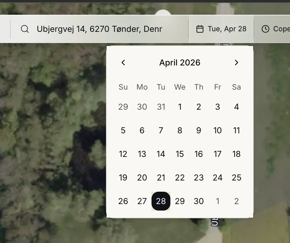 The date picker lets you pick any day of the year. The sun's path in late June is dramatically different from its path in late December, especially at higher latitudes — Copenhagen at midwinter sees the sun barely clear the horizon. Switching the date lets you check whether the apartment that looks bright in your summer viewing will still see direct light in January.