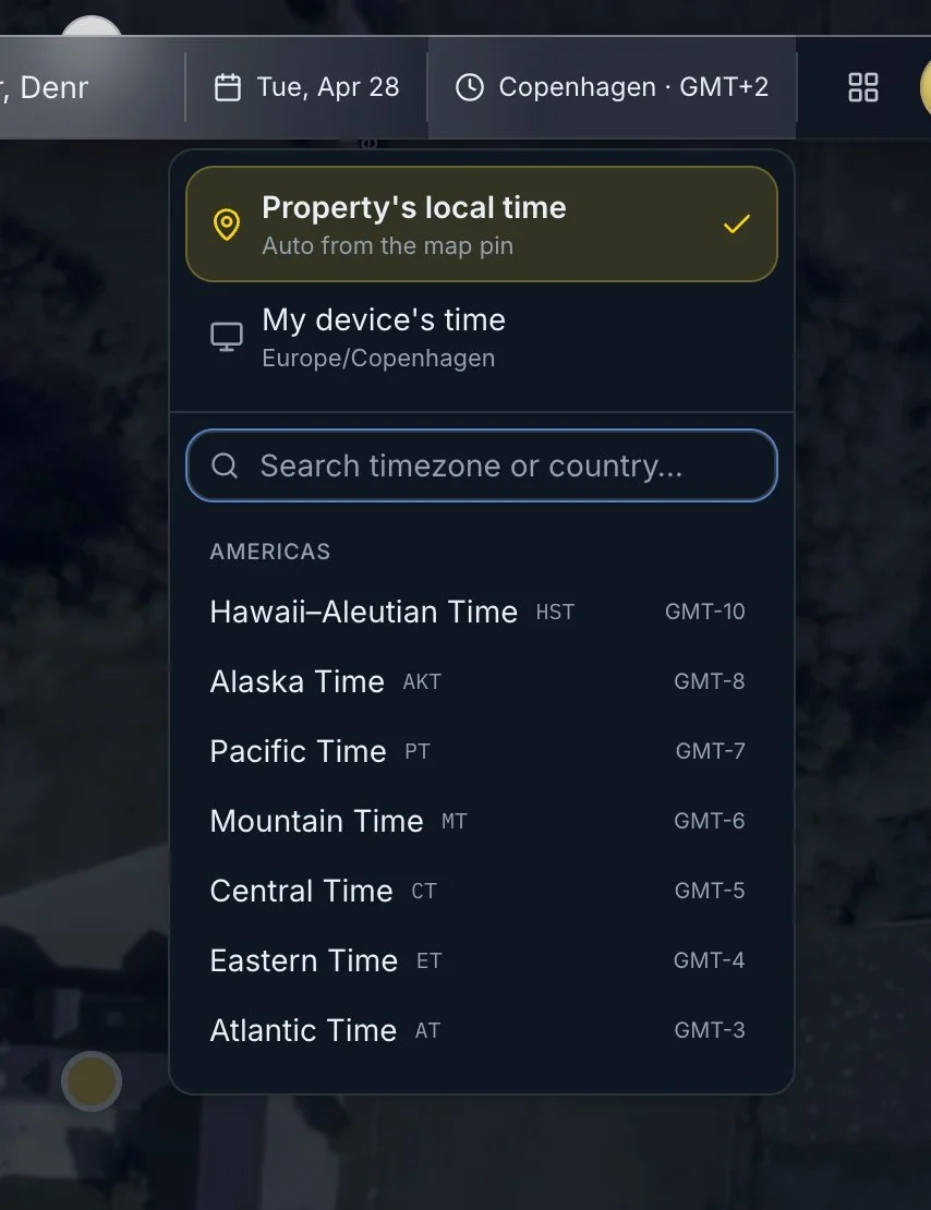 The timezone control handles a subtle problem that catches a lot of similar tools: when you look up a property in another country, what does "07:45" mean? Suntoucher defaults to the property's local time, automatically derived from the map pin, so the dial reads in the same hours someone living there would experience. A manual override is available when you want to align with your own timezone instead. (Timezone handling is still marked beta — edge cases around DST transitions are the main thing we're refining.)